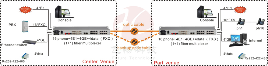 The phone provides 16 telephone Optical 1 to 4 E1 interface, 4 10/100 / 1000M Gigabit Ethernet interface (wire speed 1000M), as well as four business expansion interface. 4 port Ethernet interface switching, VLAN support division. 4 Extended service interface can be used as RS232 / RS485 / RS422 asynchronous data, voice signal, twenty-four wire E & M audio signals, digital signals, transmission channel, the application is very flexible.