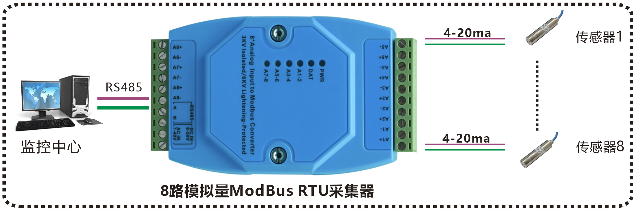 | 產(chǎn)品功能描述 | 工業(yè)軌式 8路0-20MA/4-20MA/0-10V/0-5V模擬量Modbus RTU采集器 |