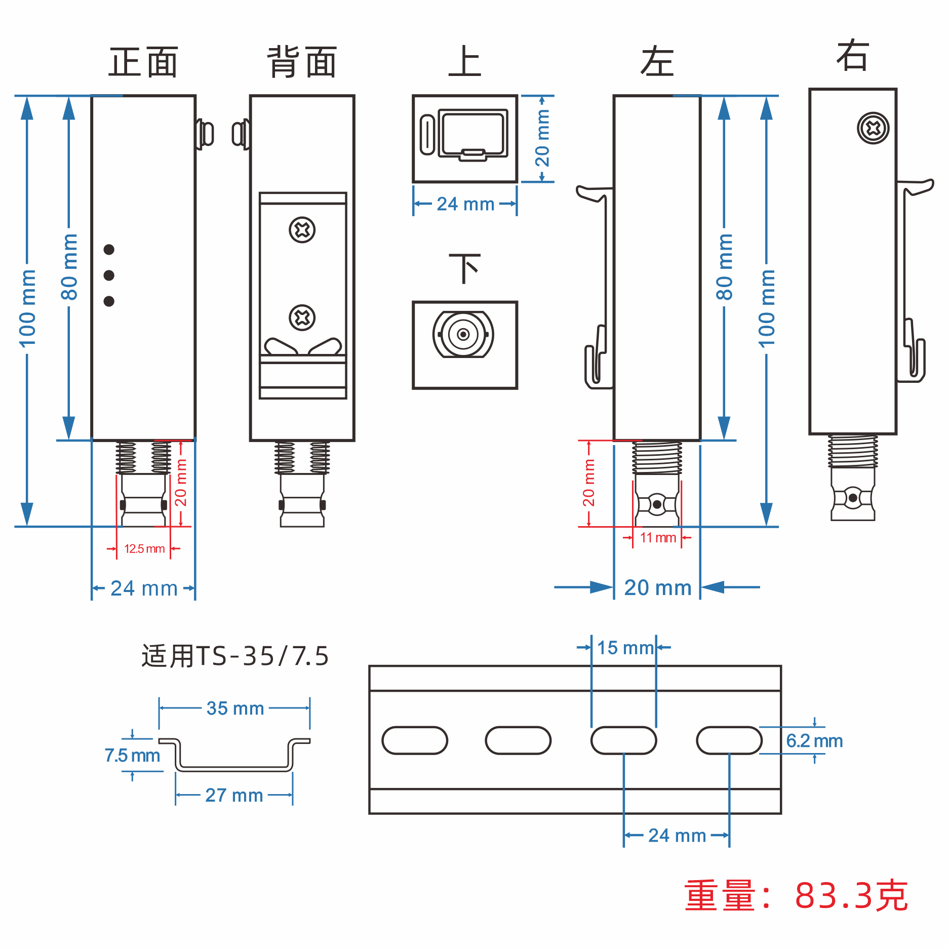 外殼:IP40防護等級 尺寸:100mm(長) x 24mm(寬) x 20mm(高) 安裝方式:導軌安裝、壁掛式安裝 |