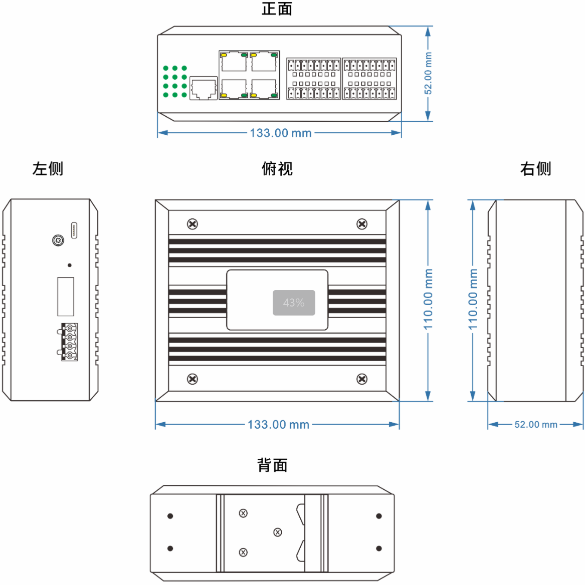 外殼:IP40防護(hù)等級(jí),鋁合金材質(zhì) 尺寸:133mm(長(zhǎng)) x 110mm(寬) x 52.0mm(高) 裝方式:導(dǎo)軌安裝、壁掛式安裝 |