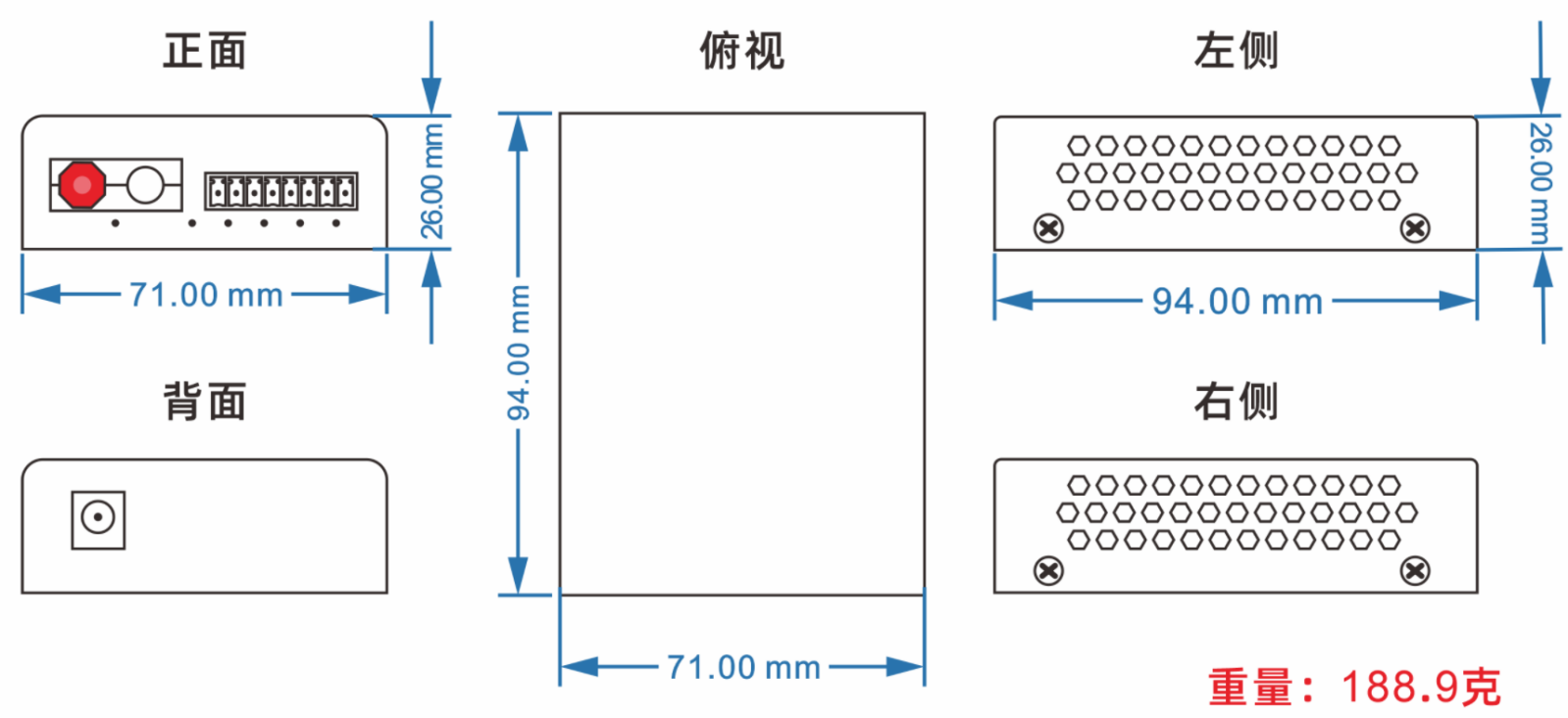 | 重量 | 外置電源/內(nèi)置電源:0.190Kg/臺 0.399kg/臺 |