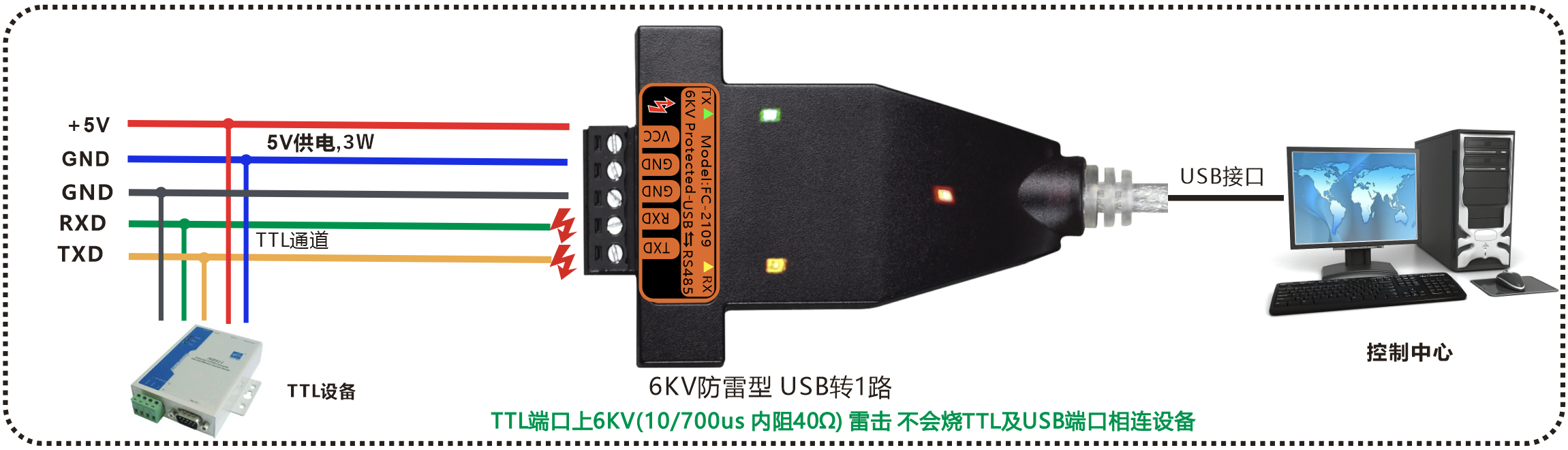 | 產(chǎn)品功能描述 | 防雷型USB轉(zhuǎn)1路TTL轉(zhuǎn)換器,帶USB線 |