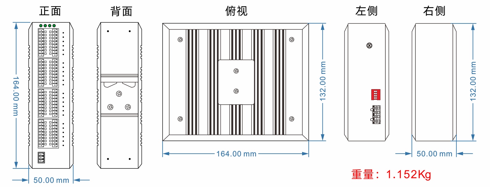 外殼:IP40防護(hù)等級(jí),鋁合金材質(zhì) 尺寸:164mm(長(zhǎng)) x 132mm(寬) x 50mm(高) 安裝方式:導(dǎo)軌安裝、壁掛式安裝 |