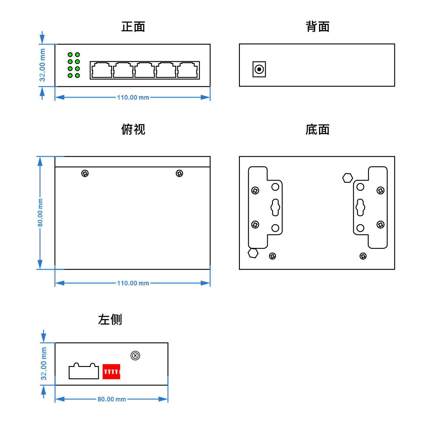 (110mm(長) x 80mm(寬) x 30mm(高) 安裝方式:導(dǎo)軌安裝、壁掛式安裝 |