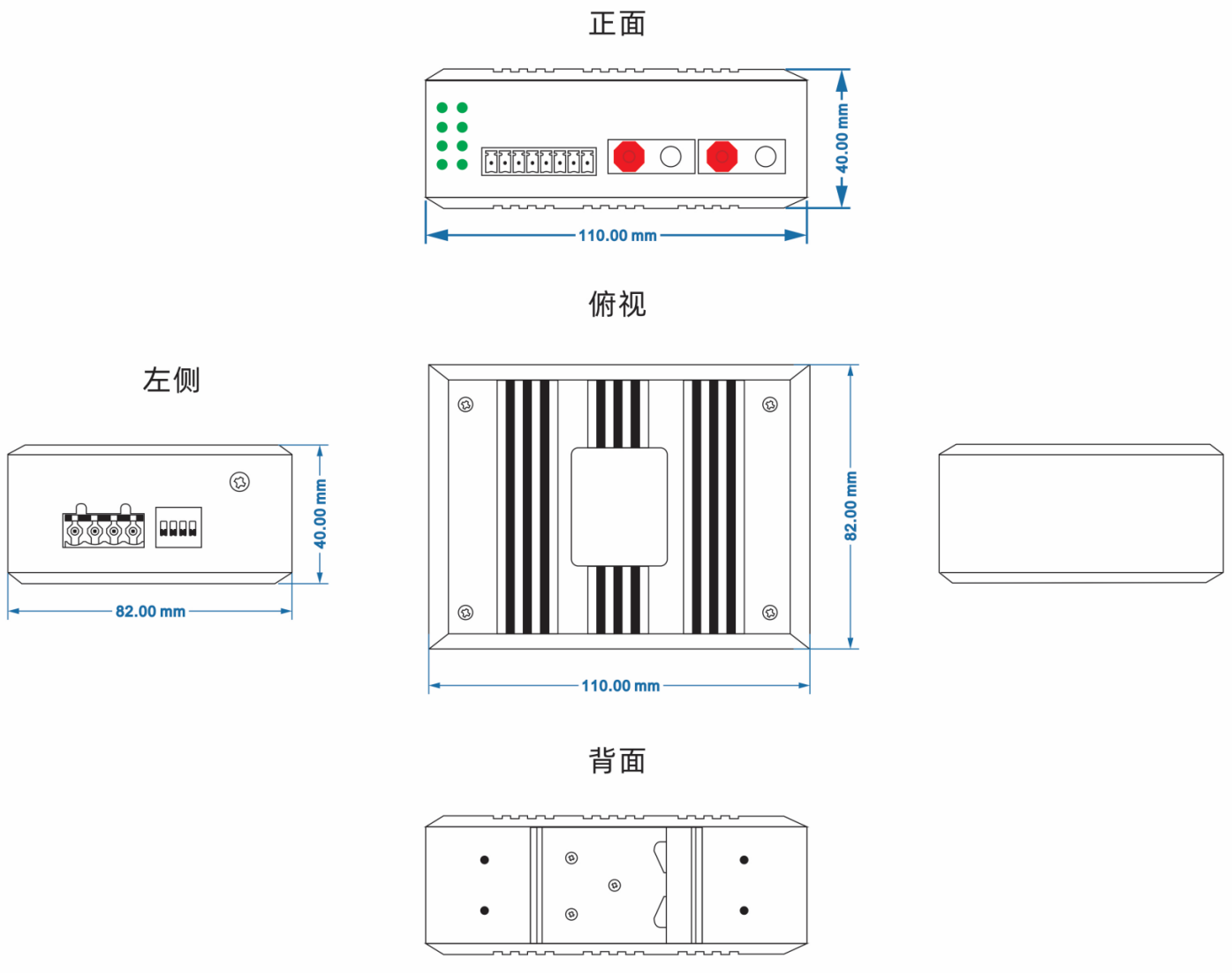 (110mm(長(zhǎng)) x 86mm(寬) x 40.5mm(高) 安裝方式:導(dǎo)軌安裝、壁掛式安裝 |